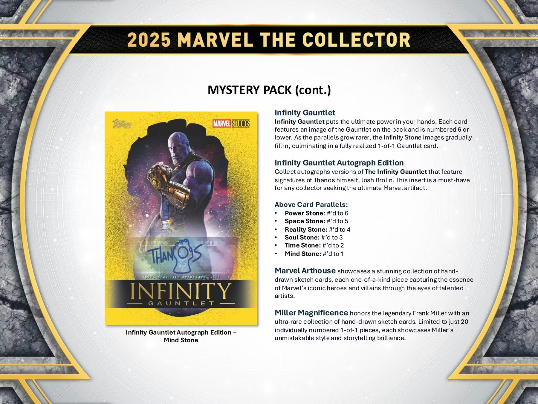 - 미스터리 팩 - <마블 투모로우>, <마블 아트하우스>, <밀러 매그니피선스>, <인피니티 건틀릿> 등의 프리미엄 인서트 라인업으로 구성
